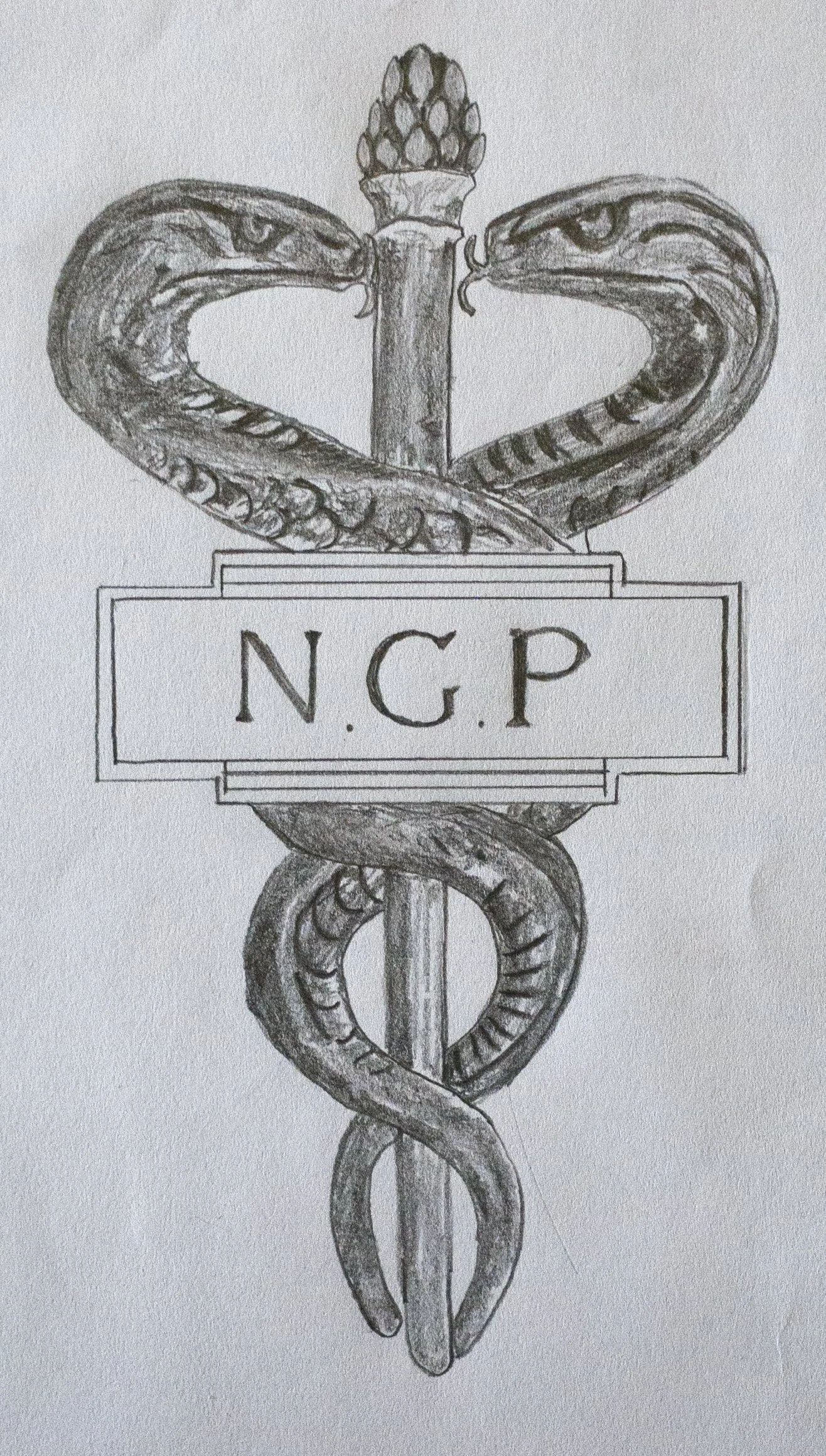 I dedicated my design for this project to my grandfather Norman Goundry Pearson by creating a vector file in Adobe Illustrator for machine embroidery. He was a doctor who had won a BMA (British Medical Association) award in recognition of his work in treating and researching lung conditions, which is why I decided to try and integrate his initials with the Rod of Asclepius which is the symbol associated with healing and medicine. This was a challenging project, especially when it came to balancing out the overall design with this set of letters.